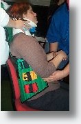 | Als nächstes werden die beiden Hüftgurte angebracht. Dazu wird der Gurt jeweils unter dem Gesäß und Bein des Patienten hinduchgezogen und dann über den entfernten Oberschenkel zur gegenüberliegenden weißen Schnalle geführt. Jeder Gurt läuft also unter dem ersten Oberschenkel und über dem zweiten Oberschenkel in "Verlegerichtung" gesehen entlang. Nachdem mit beiden Gurten so verfahren wurde, sollten diese sich im Schritt überkreuzen. Bei Verdacht auf Verletzungen in der Leistengegend können die Gurte auch um das jeweilig erste Bein geschlungen werden und dann auf der Ausgangsseite des Gurtes in das Gurtschloss eingeklingt werden. Bei Oberschenkelfrakturen sollte gegebenenfalls auf die Beckengurte ganz verzichtet werden. |