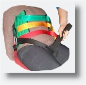 | Zunächst wird das KED mit der weichen Seite zum Patienten vorsichtig zwischen Sitz und Patient geschoben. Dies ist am einfachsten, wenn man das System schräg von oben in den Spalt zwischen Patient und Sitz schiebt und erst dann achsengerecht ausrichtet. Das KED sollte nun unten auf der Sitzfläche anstoßen. Nun können die Beckengurte gelöst werden (Kennzeichen: weiße Schnalle), damit sie beim weiteren Vorgehen nicht im Weg sind. Als Nächstes können die Bruststützklappen des KED um den Thorax des Patienten gelegt werden. Dabei ist darauf zu achten, dass das KED nun so weit nach oben geschoben wird, dass die Stützklappen genau unter den Achselhöhlen zu liegen kommen. Da durch wird verhindert, daß der Patient später beim Herausheben mit dem KED in diesem nach unten verrutschen kann. |