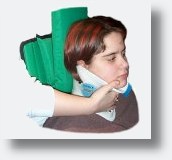 Jetzt kann das Kissen in den Nacken des Patienten gelegt werden, um den Zwischenraum zwischen KED und Patient auszufüllen. Um das Kissen der Breite des Zwischenraumes anzupassen, kann es im Genickbereich des Patienten doppelt gefaltet werden. Beim Einlegen des Kissens ist darauf zu achten, daß kein Druck auf das Genick des Patienten ausgeübt wird. |